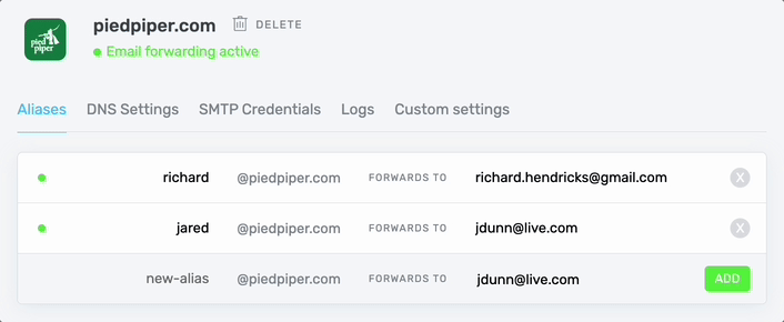 From your ImprovMX aliases page, input your new alias name, a destination address, and click the ADD button.