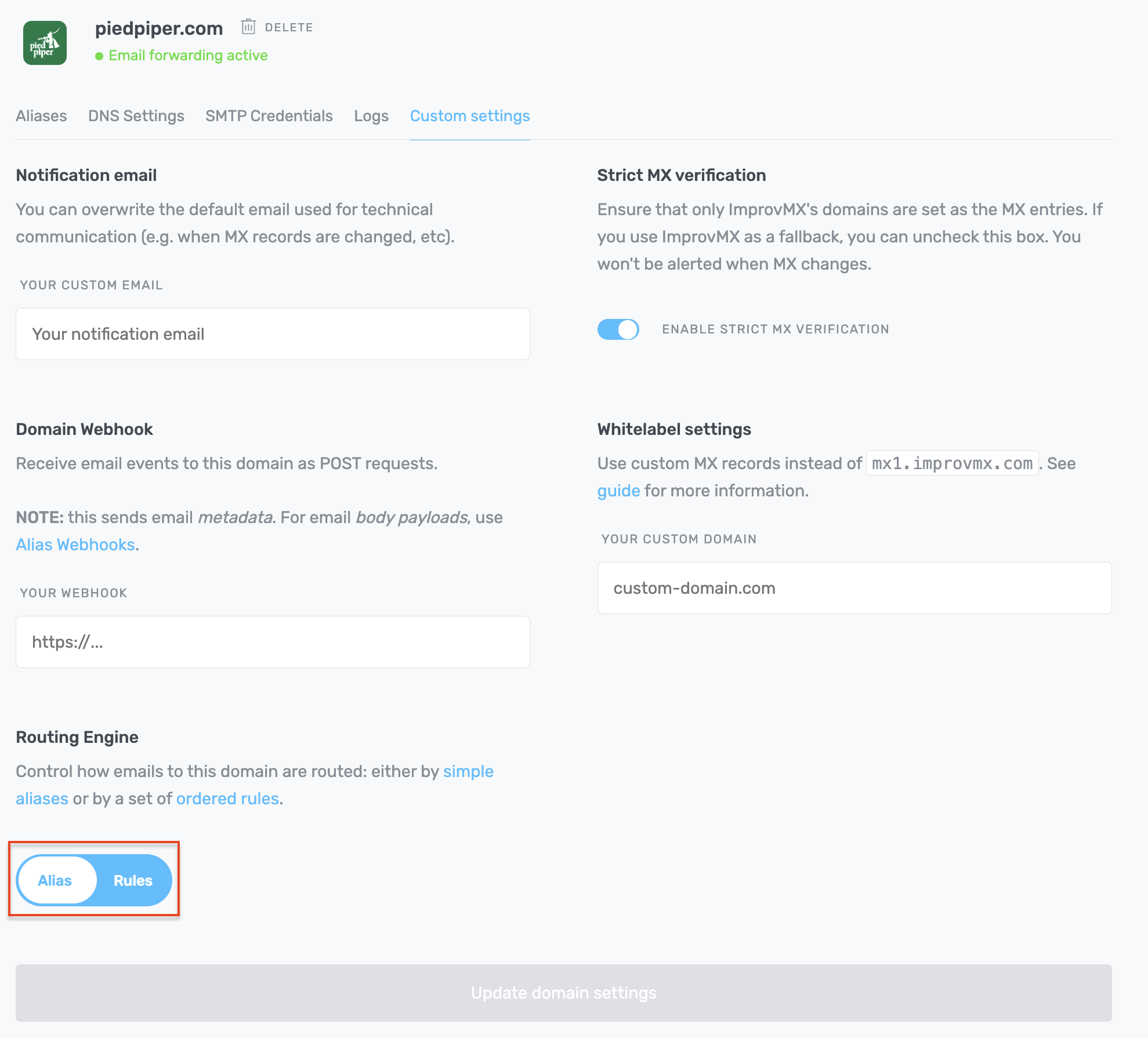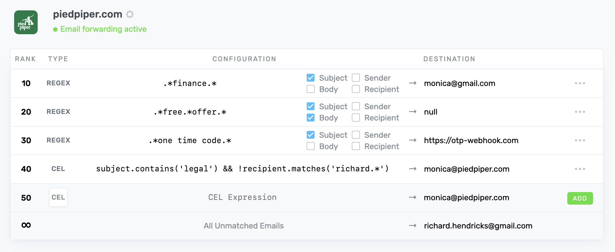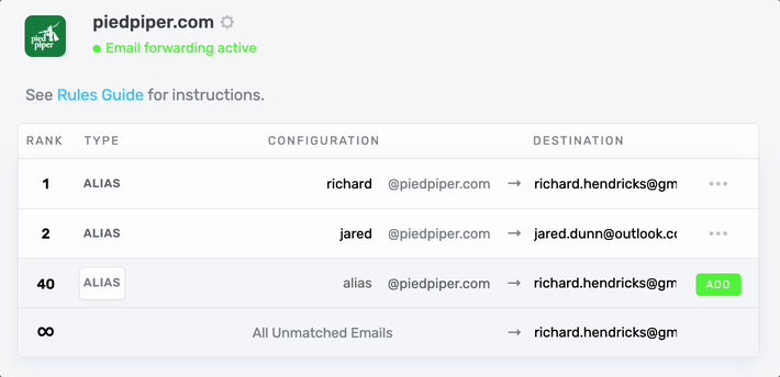 ImprovMX lets you craft fully customizable routing rules to intelligently route incoming emails.