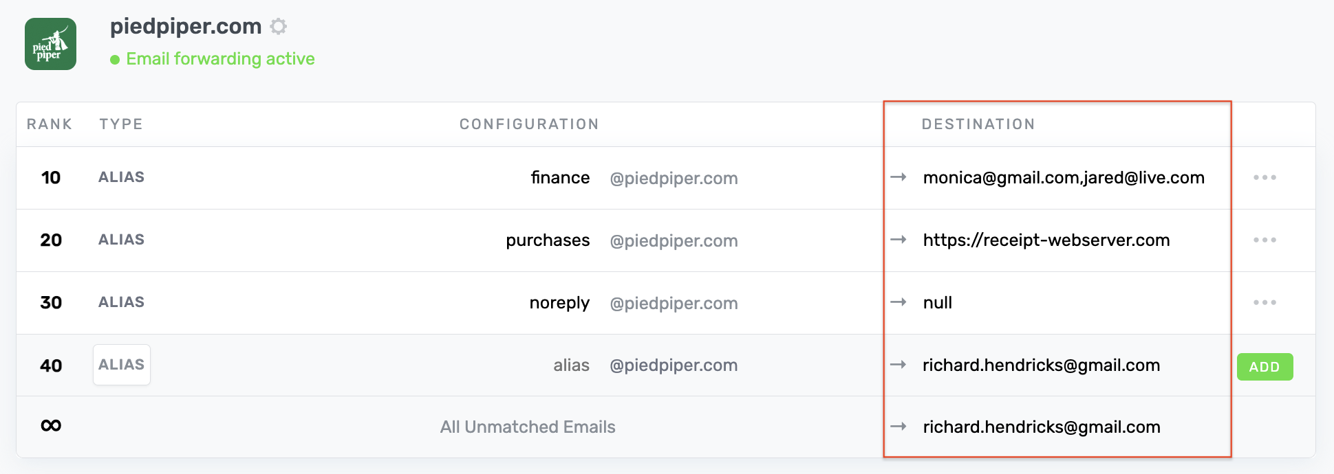 Specify an email address for each rule. Or specify multiple addresses, null, and/or webhooks. This follows the same convention as our alias destinations.