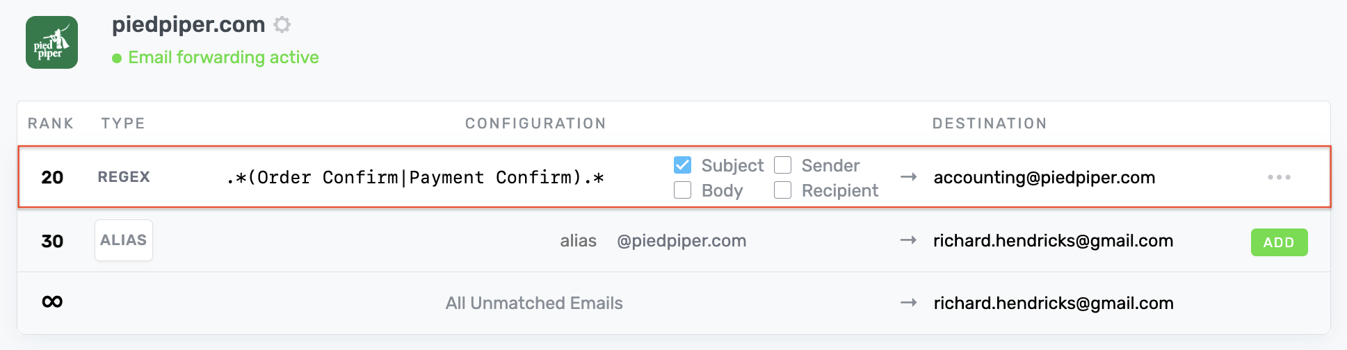 Regex rules let you match arbitrary text in the email's subject, body, sender, or recipient using regular expressions.